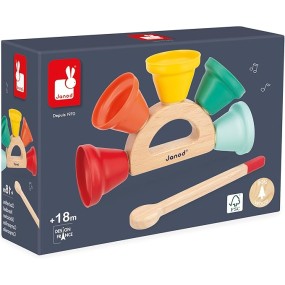 Faites résonner la joie ! Voici un jouet musical qui ravira les bébés dès 18 mois. Composé de 5 jolies clochettes en métal, fixées sur une poignée en bois, et dune baguette pour les faire sonner, ce jouet d'éveil sonore est un véritable enchantement. Facile à prendre en main, ce jouet premier âge offre une initiation ludique aux sons. Les clochettes colorées stimulent l'acuité visuelle, leur son permet léveil musical et la manipulation de la baguette invite à la coordination des mouvements. Chaque clochette produit un son différent, permettant aux tout-petits de découvrir les nuances sonores et de développer leur oreille musicale. Avec ce jouet premier âge, les bébés peuvent créer leur propre concert à la maison ! Ils samuseront à faire sonner les clochettes, réagiront aux différentes sonorités et partageront des moments musicaux avec toute la famille. Ce jouet instrument de musique fait partie de notre gamme Gioia, une invitation à léveil musical dans la joie, permettant aux tout-petits de découvrir le monde des sons de manière ludique et sous le signe du partage. Jouet en bois certifié FSC.