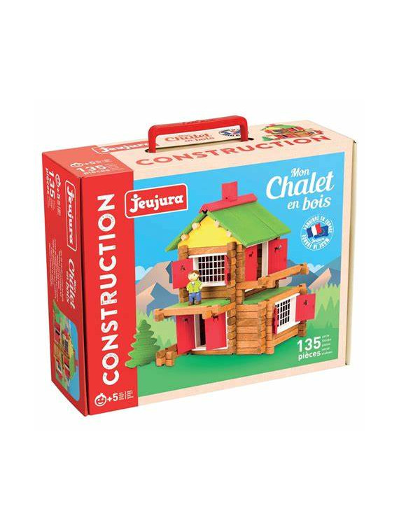 Mon Chalet en Bois - 135 pièces : jeu de construction en bois naturel et teinté avec une notice de montage.