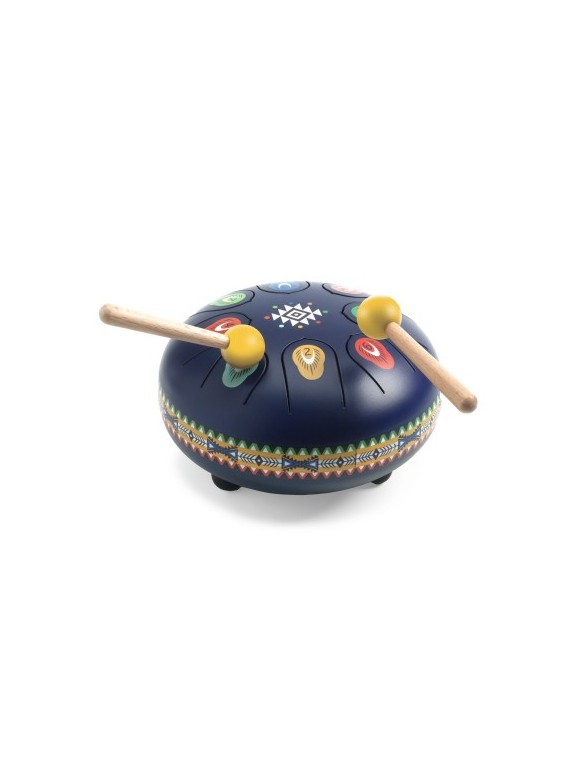 Un magnifique tambour en acier joliment illustré sur le thème amérindien. Cet instrument de musique à percussion a 8 languettes correspondant à 8 notes de musique. Très intuitif et facile à jouer, lenfant tape sur les languettes avec les baguettes : par ses vibrations, linstrument émet un son doux et relaxant. Parfait pour créer ou reproduire de mélodies apaisantes !