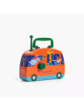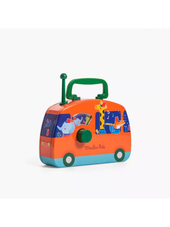 Bus radio en métal, au style estafette publicitaire, illustrée d'une fanfare d'animaux joyeux et colorés ! Il suffit de tourner le bouton pour les entendre jouer et les voir défiler derrière la fenêtre.