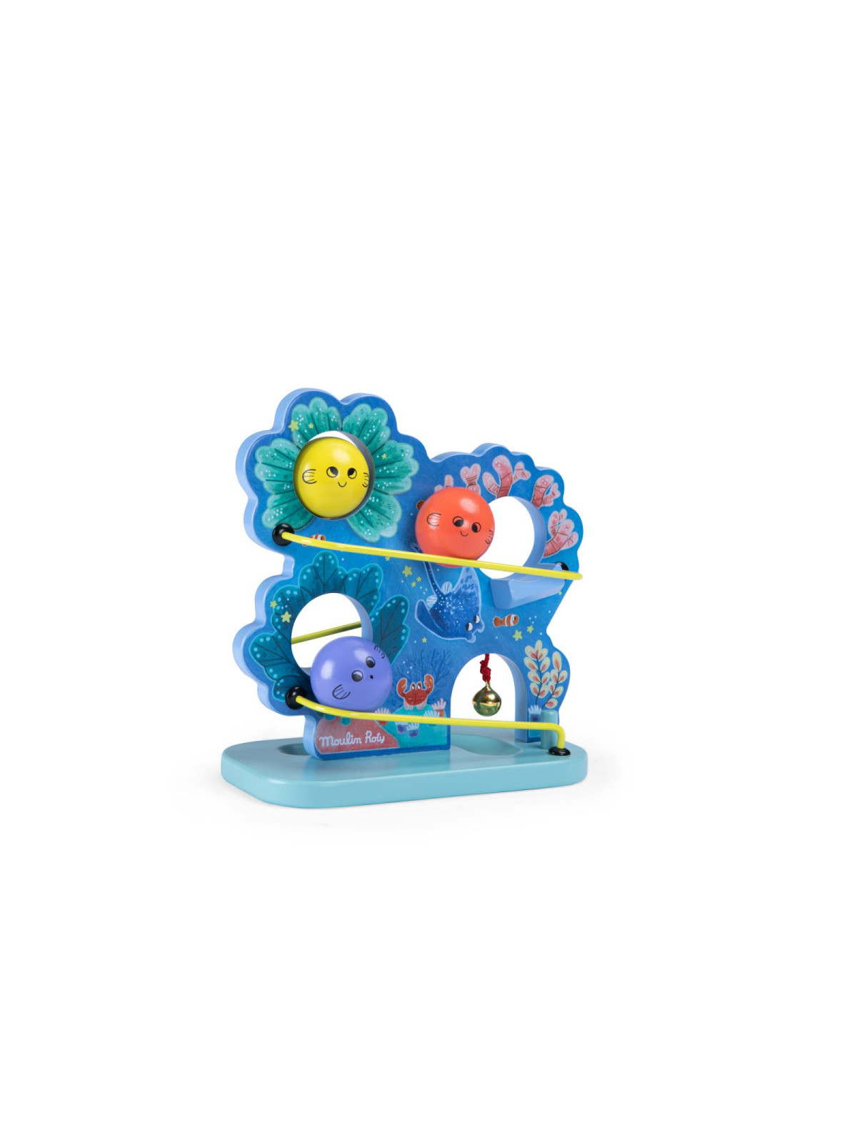 Bienvenue dans les fonds coralliens avec cette cascade en bois aux couleurs de l'océan ! Bébé va adorer faire dévaler les boules à l'effigie de petits poissons qui feront tinter la clochette à l'arrivée. Contient 3 boules.