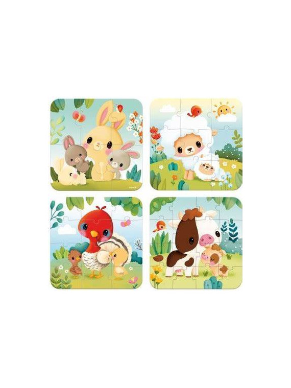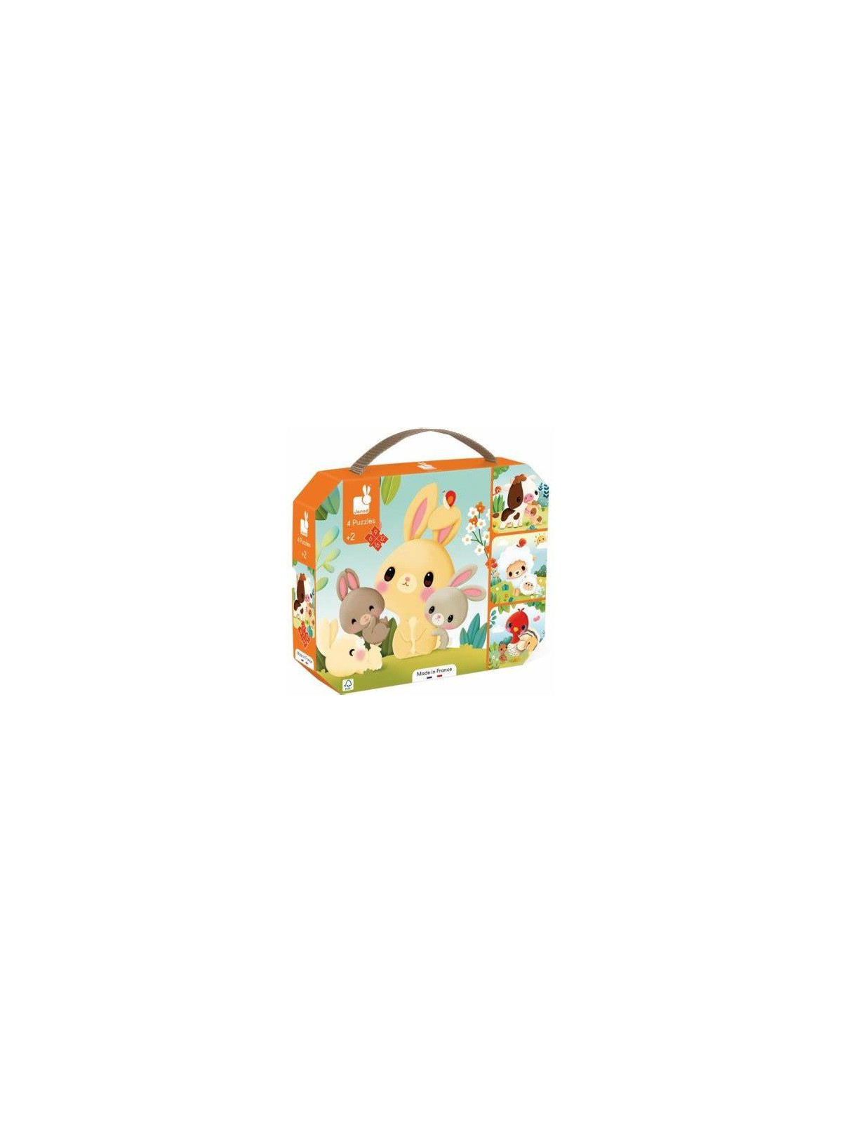 Rendez visite aux animaux de la ferme ! Avec ce lot de 4 puzzles évolutifs, votre enfant dès 2 ans enrichit son vocabulaire et développe logique et motricité, le tout bercé de tendres illustrations. La particularité de ces 4 puzzles en carton, cest leur nombre de pièces : ils sont évolutifs, allant de 6 à 16 pièces ! Ainsi, bébé peut prendre le temps de progresser tout en se familiarisant avec les animaux de la ferme. Cest un choix idéal pour aider votre enfant à développer sa motricité fine pas à pas, en passant dun puzzle de 6 à 9 pièces, puis de 12 à 16 pièces : il sera ravi de voir quil progresse ! Et pour quil puisse profiter de ses puzzles ferme en toute autonomie, votre tout-petit pourra saider de la couleur présente au dos de chaque puzzle pour mieux les associer. Enfin, qui de mieux pour éveiller votre bébé que les petits animaux de la ferme ? Laissez-vous bercer par les illustrations toutes douces, elles aident votre enfant à apprendre le nom des animaux et de leurs petits : un lapin et ses lapereaux, un mouton et son agneau, une vache et son veau, et un dindon et ses dindonneaux Oui, oui ! Malin, vos 4 puzzles se rangent dans la valisette à limage de nos petits compagnons. Les puzzles sont idéals pour apprendre aux enfants à faire preuve de logique, de concentration et de calme. Ajoutez à cela de belles illustrations, et vous obtiendrez un premier puzzle enfant ultra-bénéfique pour laider à bien grandir ! Ce lot de puzzles est fabriqué en France et composé de carton certifié FSC. Il est décoré avec des encres végétales.