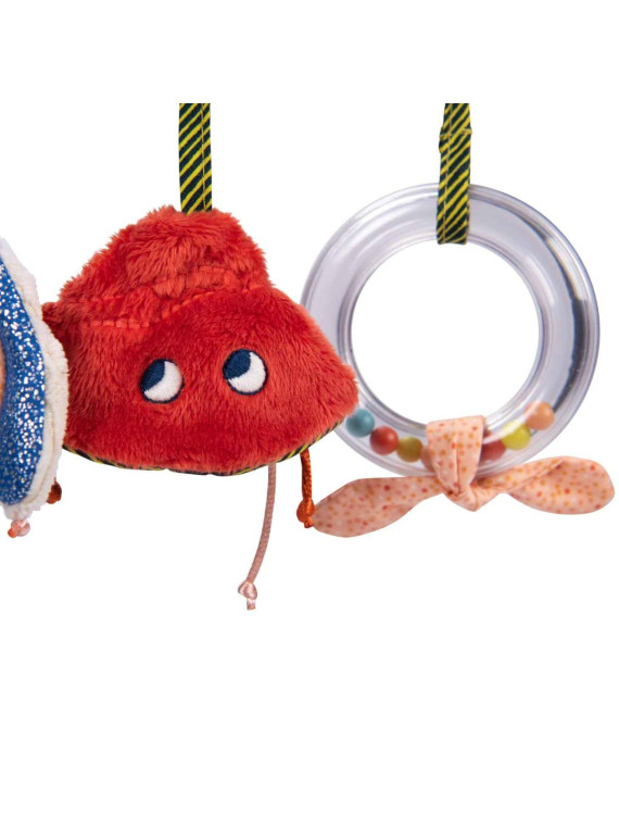 Spirale d'activités décorée d'animaux, de coquillages et plantes marines qui invite bébé à jouer sous l'océan : miroir, anneau à billes, étiquettes à saisir ou mâchouiller. Elle s'enroule facilement sur une poussette, un cosy ou un portique d'activités.